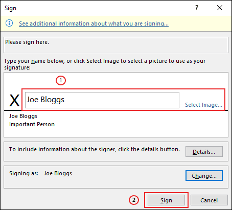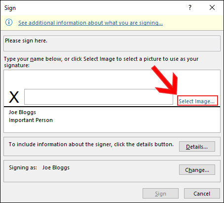 Görüntülenen “İmza” kutusuna adınızı yazın veya el yazısı imzanızın bir resmini eklemek için “Resim Seç” e tıklayın.