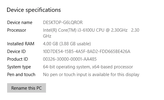 - Adım: Yüklü RAM’i arayın bunun yanında, ne kadar RAM’e sahip olduğunuzu belirten bir sayı bulunmalıdır. Aşağıdaki örnekte, cihazın toplamda 4GB RAM’e sahip olduğunu ve yaklaşık 3.88GB kullanılabilir olduğunu görebilirsiniz: