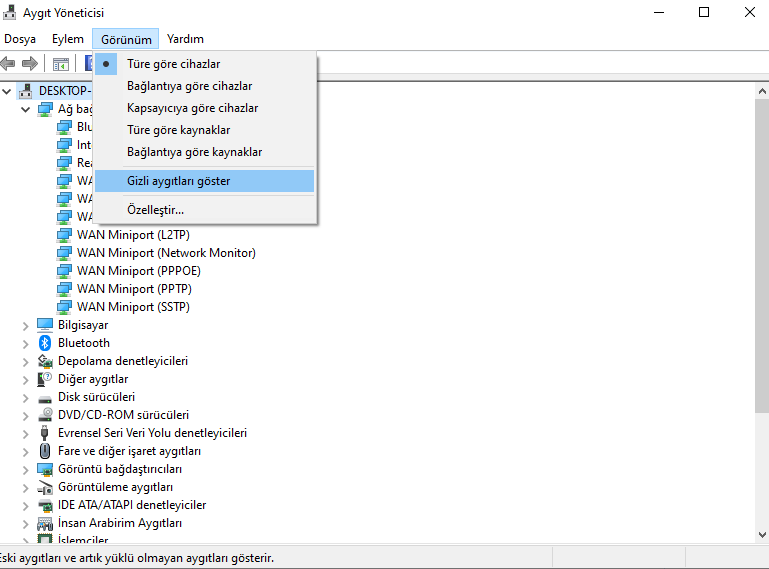- Gizli Cihazlar üzerinde seçeneği Görünüm menüsünden