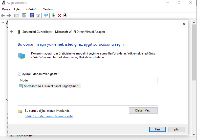 - Bilgisayarındaki sürücülerin bir listesinden seçmeme izin ver yapın.