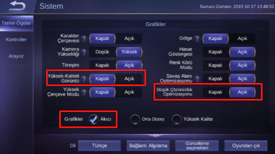 Oyun içi ayarlar bölümünden ise, üstte belirttiğimiz temel öğeler bölümünde bulunan yüksek kalite seçeneğini kapatıp. Düşük çözünürlük modunu seçerek. Ve yine alt kısımda bulunan grafikler bölümünden akıcı olarak belirtilen ibareyi seçerek bağlantı. Ve oyun hızını da artırabiliriz.
