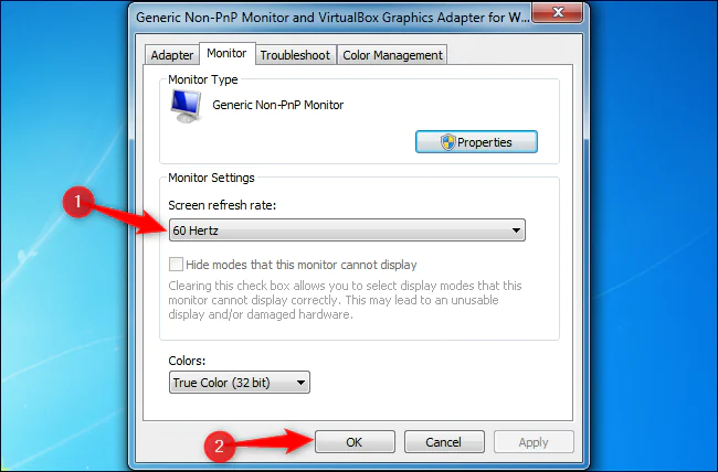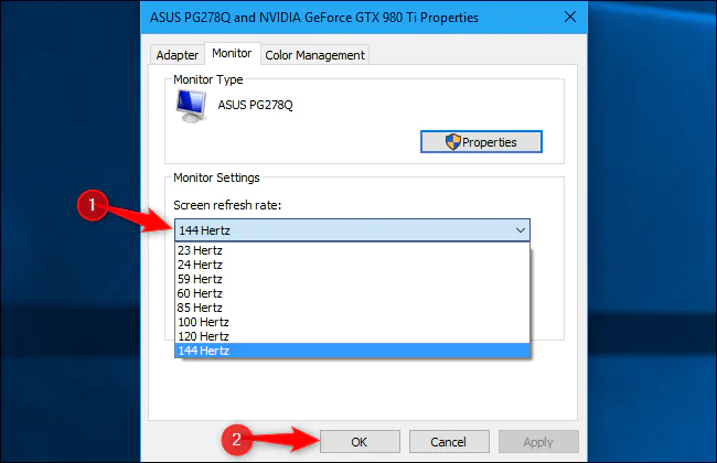 “Monitör” sekmesine tıklayın ve ardından “Ekran Yenileme Hızı” kutusundan istediğiniz yenileme hızını seçin. Değişikliklerinizi kaydetmek için “Tamam” ı tıklayın. Windows hemen yeni yenileme hızına geçecektir.