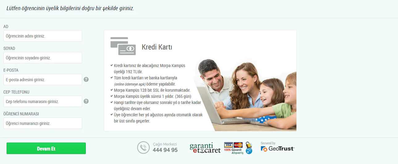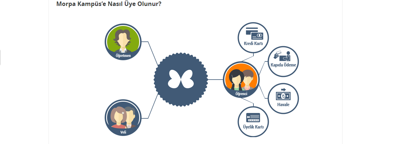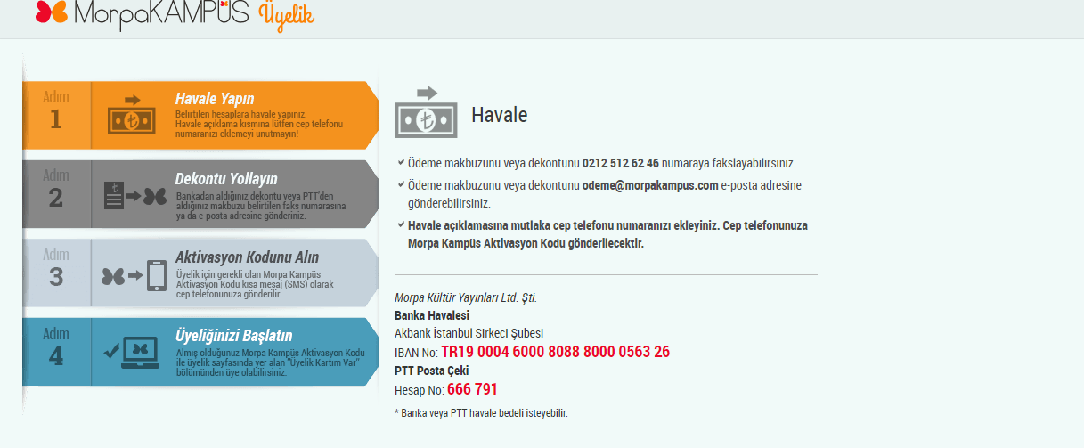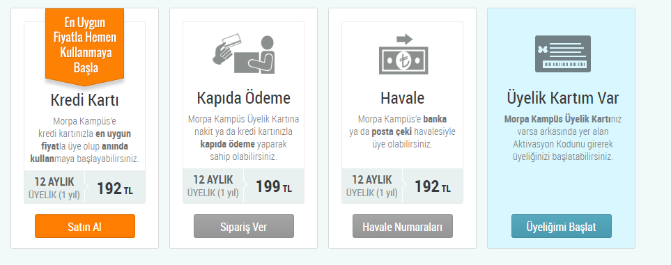 Morpa Kampüs’e kayıt işlemini internet üzerinden kredi kartı, havale, eft, posta çeki, veya kapıda ödeme seçeneği ile ödeme yapılabilmektedir.