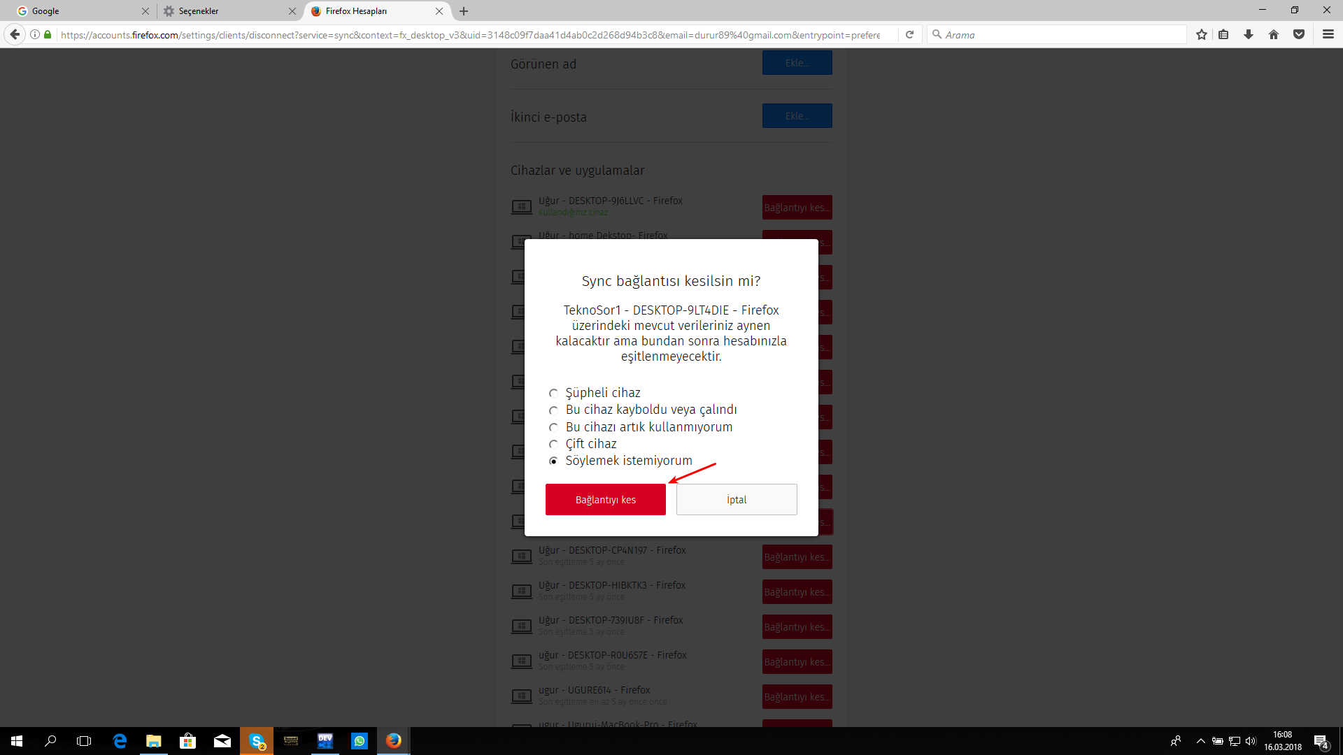 - Bu ekranda yapmamız gereken sadece, hesabı sileceğimiz cihazın karşısındaki ‘Bağlantıyı kes’ butonuna tıklamak.