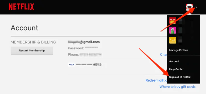 - Hesap sayfanızı açın, profil fotoğrafınızın yanındaki aşağı oku seçin ve ardından Netflix’ten Çıkış Yap’ı seçin .