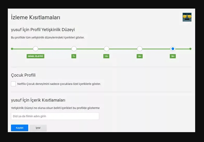 Türkiye’deki üyeler, 18 yaş altındaki kişilerin ilgili Netflix hesabını kullanacağı durumlarda, 18+ yetişkinlik düzeyine sahip film ve dizileri izlemek için kayıt sırasında bir PIN oluşturmak zorundadır.