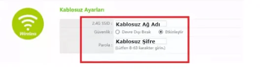 • Ara yüz sayfası açıldığında ilk gelen sayfada ekranın alt kısmında bulunan Kablosuz Ağ Adı ve Kablosuz Şifre bölümlerinden kablosuz ağ adımızı ve şifremizi düzenleyip ayarları kaydediyoruz.