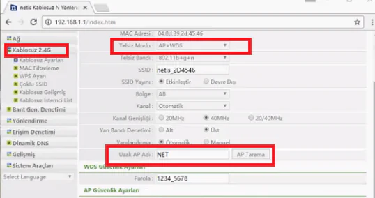 • Açılan sayfada ‘Telsiz Modu’ bölümünde çıkan seçeneklerde ‘AP+WDS’ seçeneğini seçiyoruz.