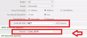 • Ağ seçimi yapıldıktan sonra Uzak AP Adı menüsünün alt kısmında Parola bölümü açılacaktır. Bu kutucuğa, menzilini genişletmek için seçtiğimiz kablosuz ağın şifresini yazıyoruz ve alt kısımdan Kaydet butonuna tıklıyoruz.