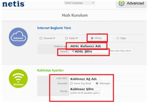 - Açılan sayfada üst bölümde Select Language (Dil Seçin) bölümünden Türkçe dil seçeneğin seçiyoruz. Bu aşamadan sonra Netis WF2414 modem kurulum sayfamız açılacaktır. Kuruluma başlayabiliriz.