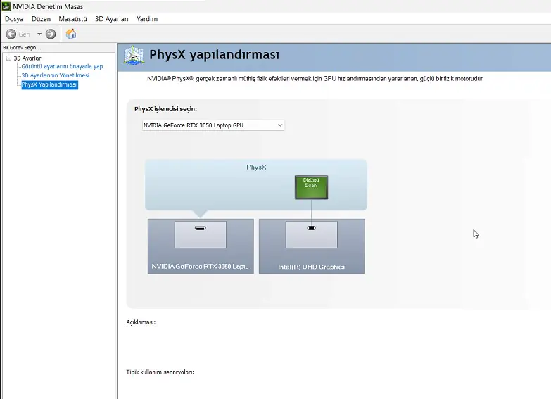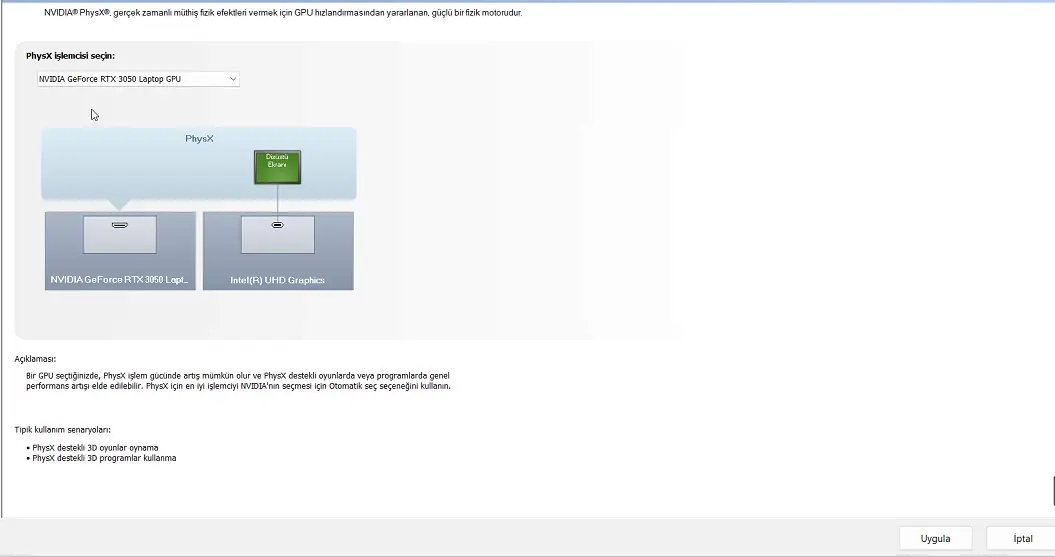 Açılan sayfa da PhysX işlemcisini seçin bölümümden kullandığımız harici ekran kartını seçerek uygula butonuna tıklamamız gerekiyor.