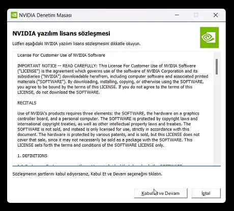 Eğer İlk defa Nvidia Denetim Masasını başlatıyorsanız ekrana Yazılım sözleşmesi gelecektir. Bunu kabul et ve Devam butonuna tıklayarak onaylamanız gerekir.