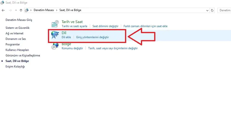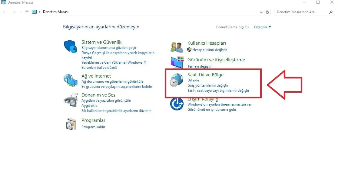 - Açılan ‘Denetim Masası’ penceresinde, ‘Saat, Dil ve Bölge’ bölümüne tıklayıp işlemlerimize devam ediyoruz.