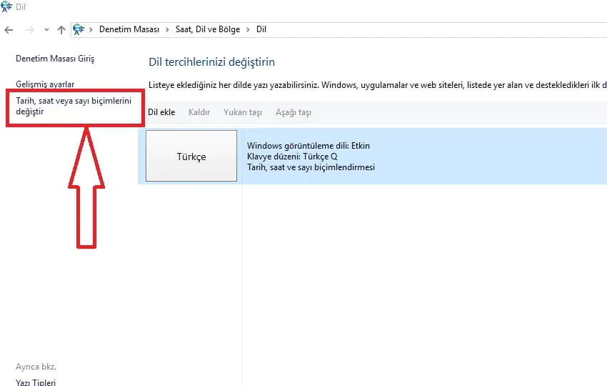 - Devamında gelecek olan pencerenin sol tarafında bulunan, ‘Tarih, saat veya sayı biçimlerini değiştir’ menüsüne tıklıyoruz.