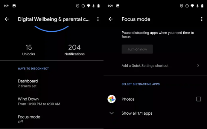 Google, Odak Modu’ndaki gibi uygulama zamanlayıcılarının, insanların zamanın% 90’ından fazlasını aşan uygulamalardan uzak durmasına yardımcı olduğuna inanıyor. Hangi uygulamaları duraklatmak istediğinizi, Facebook ve Instagram gibi, sizi uyarılarla bölme eğiliminde olan birini seçebilirsiniz. Ancak, bazı mesajlaşma uygulamalarını acil durumlar için açık tutabilirsiniz.
