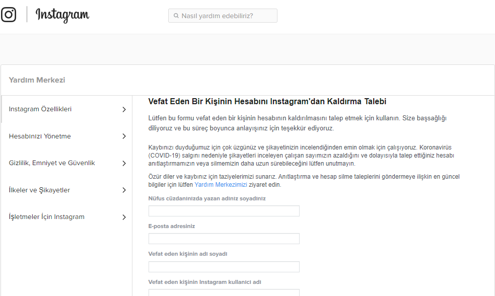 • Vefat etmiş bir kişinin Instagram hesabının kalıcı olarak silinmesini talep etmek için hesabınızın olması şart değil.