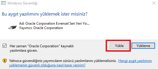 • Bir sonraki adımda ise, aşağıdaki ekran görüldüğü gibi bilgisayarımıza bazı sanal donanım yazılımları (virtual driver) yükleneceğinden dolayı ‘Windows’, yazılım kaynağının (yayımcısının) güvenli olup olmadığı ile ilgili uyarı yapıyor ve yüklemeye devam etmek için onay istiyor; ‘Yükle’ butonuna tıklayarak devam edelim.