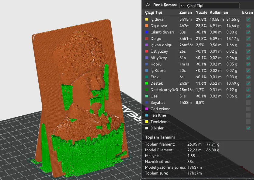 5. Dilimleme Yapın: Ayarlarınızı tamamladıktan sonra modelinizi dilimleyin ve yazıcınızın kullanabileceği bir G-code dosyası oluşturun.