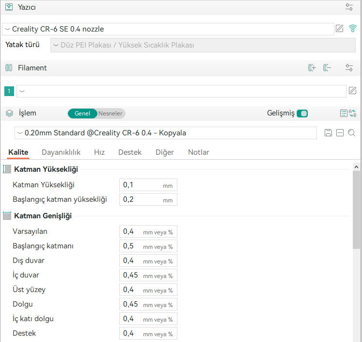 Katman yüksekliği, doluluk oranı, baskı hızı ve destek yapıları gibi birçok ayarı özelleştirebilirsiniz. Bu, projelerinizi tam anlamıyla ihtiyaçlarınıza göre şekillendirmenize olanak tanır.
