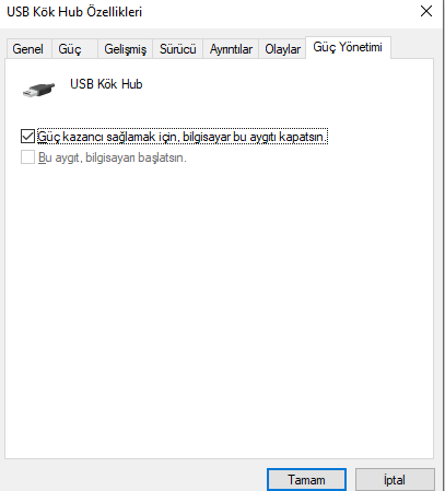 - USB Kök Hub’a sağ tıklayın ve Özellikler / Güç Yönetimi’ni seçin ve Güç tasarrufu için bilgisayarın bu cihazı kapatmasına izin ver yazan tüm kutuların işaretini kaldırın