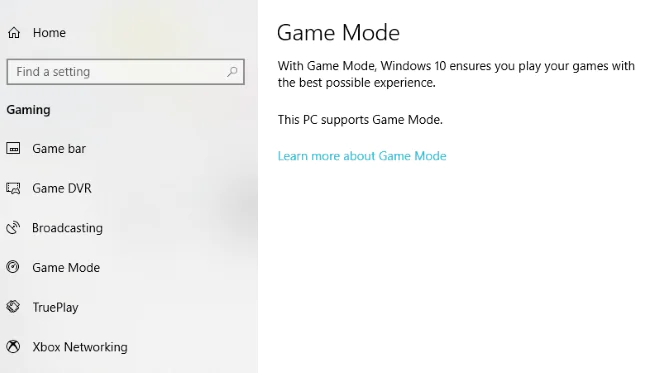 İşletim sisteminin daha sonraki sürümlerinde bir oyun modu, Windows 10 oyuncuları için yerleşik optimizasyonlar bulunmaktadır. Daha fazla bilgi edinmek için Windows tuşu + I tuşlarına basın, oyun modu yazın ve bilgisayarınızı oyunlar için optimize etmek için Oyun Modunu Kontrol Et’i tıklayın.