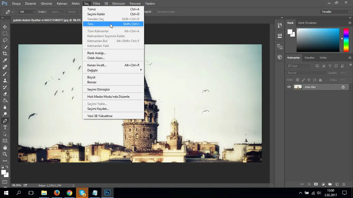 - “Seç” menüsünün içerisinden “Ters” butonuna basalım.