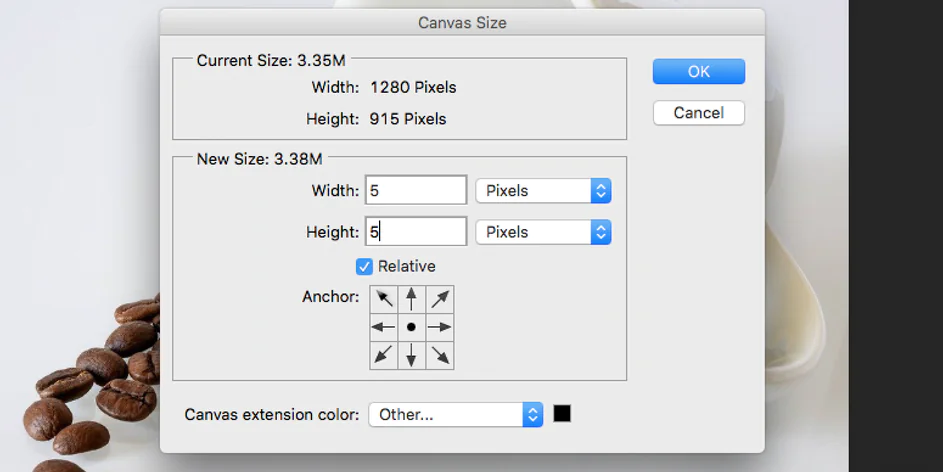 - Bağıl kutusunu girmek 5 hem de sınır boyutu olarak Genişlik ve Yükseklik kutularına. Ardından boyut birimi olarak Pikseller’i seçin, Çapa menüsünde orta noktayı tıklayın ve Tamam’a basın.