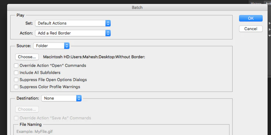 - Son olarak, Tamam’a tıklayın ve Photoshop seçtiğiniz klasördeki tüm fotoğraflara kenarlıklar eklemeye başlayacaktır.