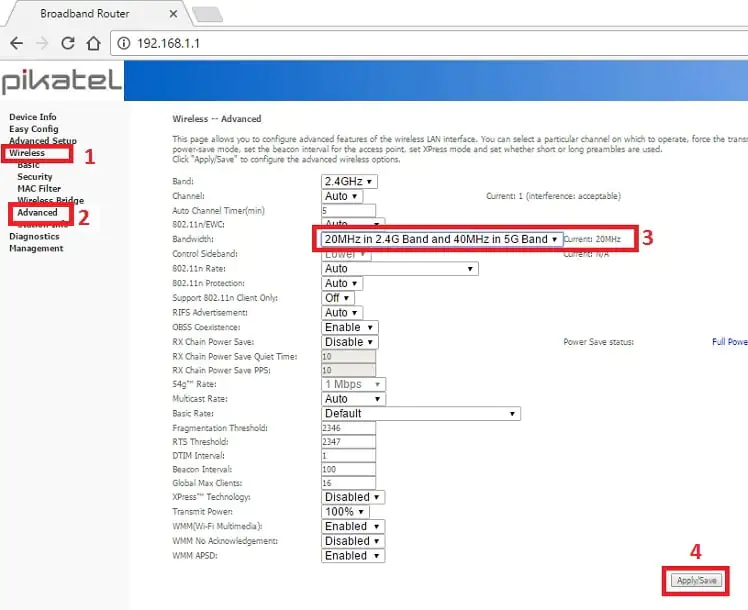 - Açılan menüde “Bandwith” kısmını, aşağıdaki ekran görüntüsünde görüldüğü gibi “20Mhz in 2.4 Band and 40Mhz in 5G band” olarak değiştirelim.