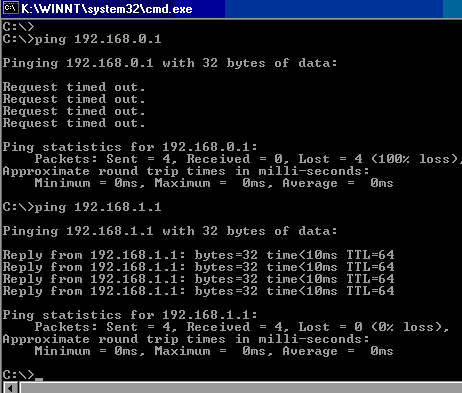 Hem başarısız bir ping (192.168.0.1) hem de başarılı bir ping (192.168.1.1) gösterdim.