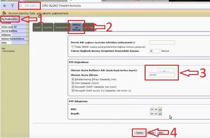 - Arayüze giriş yapmamızın ardından Ağ Bağlantıları bölümünde bulunan PPPoE ve PPPoA sekmesine geçiyoruz. Sonrasında ise bu bölümde bulunan kullanıcı ve şifre kısımlarını, servis sağlayıcımızdan bizlere iletildiği şekilde girerek alt kısımda bulunan Kaydet butonuna tıklıyoruz.