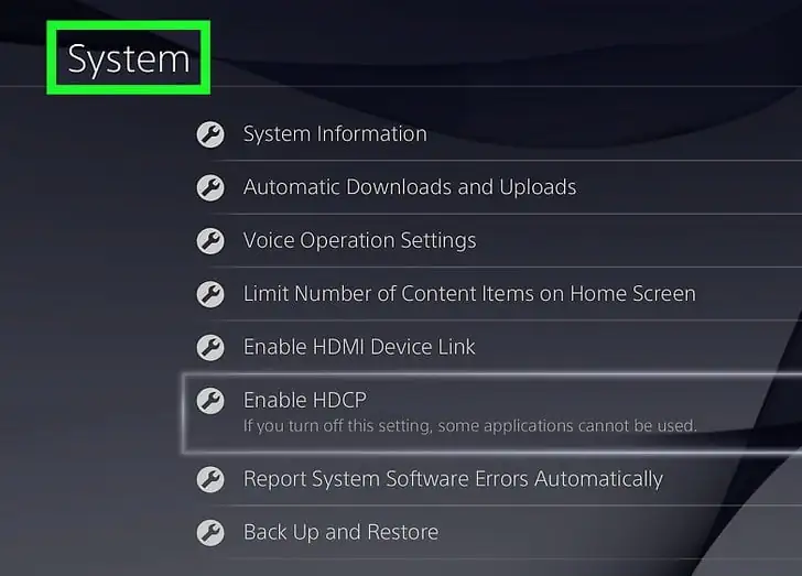 - Menü seçenekleri arasında aşağı doğru ilerleyin ve ‘Sistem (System)’ menüsünü bulun. ‘Sistem (System)’ seçeneği, ‘Erişilebilirlik (Accessibility)’ ve ‘Başlatma (Initialisation)’ seçenekleri arasındadır. ‘Sistem (System)’ seçeneğini seçmek için oyun (kontrol) kumandasında ‘X’ tuşuna basın.