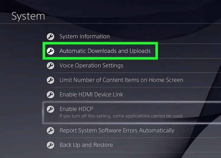 - ‘Otomatik İndirmeler ve Yüklemeler (Automatic Downloads and Updates’ seçeneğine gelin. Bu seçenek baştan ikinci sırada, ‘Sistem Bilgisi (System Information)’ ve ‘Sesli İşlem Ayarları (Voice Operation Settings)’ seçenekleri arasındadır. ‘Otomatik İndirmeler ve Yüklemeler’seçeneğinin üzerine geldikten sonra bu seçeneği seçmek için ‘X’ tuşuna basın.
