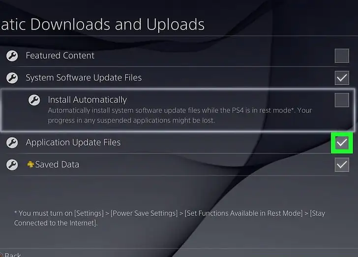 - Gelen ekranda ‘Uygulama Güncelleme Dosyaları (Application Update Files)’ seçeneğine gelin ve konsol kontrol kumandasında ‘X’ tuşuna basarak bu seçeneğin kutucuğunu işaretleyerek, oyunlar ve uygulamalar için güncellemeleri otomatik indirmeyi ve yüklemeyi aktif edin. ‘Uygulama Güncelleme Dosyaları (Application Update Files)’ seçeneği, ‘Kaydedilen Veri (Saved Data)’ ve ‘Otomatik Olarak Yükle (Install Automatically)’ seçenekleri arasındadır.