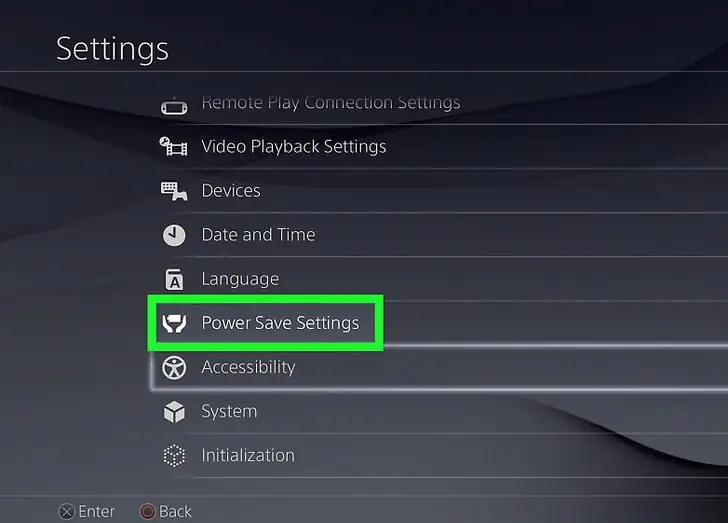 - Konsol kontrol kumandasında ‘O’ tuşuna 2-kere basın ve ‘Ayarlar (Settings)’ menü ekranına geri gelin. Daha sonra ekranı aşağı doğru kaydırın ve ‘Güç Ayarları (Power Settings)’ seçeneğine gelin. ‘X’ tuşuna basın ve bu seçeneği seçin.