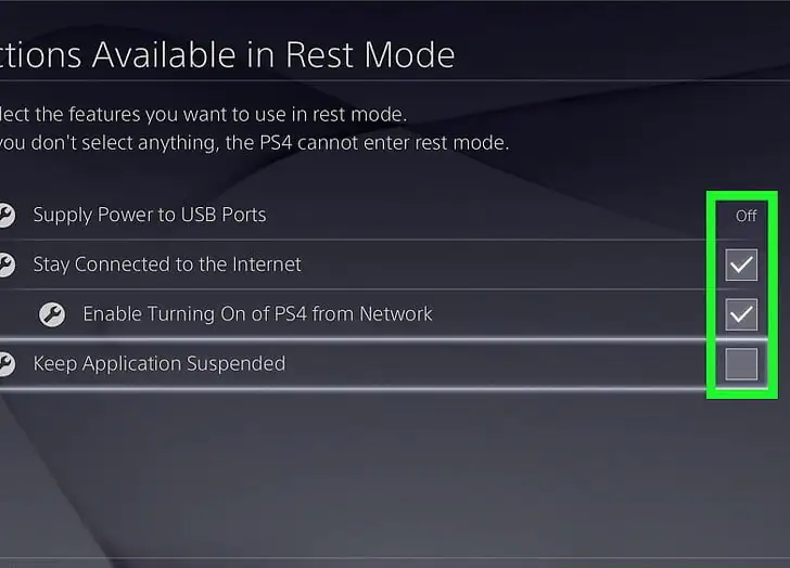 - ‘Bekleme/Uyku Modunda Erişilebilir Fonksiyonları Ayarla (Set Functions Available in Rest Mode)’ seçeneğini seçin ve gelen ekranda ‘İnternete Bağlı Kal (Stay Connected to the Internet)’ seçeneğindeki ve ‘Ağdan PS4’ü Açmayı – Başlatmayı – Etkinleştir (Enable Turning On of PS4 From Network)’ alt seçeneğindeki kutucukları işaretleyin. İlk seçenek, PS4 oyun konsolunuz bekleme/uyku modunda olsa dahi, oyunlarınızın ve uygulamalarınızın otomatik olarak güncellenmesini sağlayacak. PS4 oyun konsoluna uzaktan erişim sağlıyorsanız, ‘Ağdan PS4’ü Açmayı – Başlatmayı – Etkinleştir (Enable Turning On of PS4 From Network)’ seçeneğini de seçmeniz gerekir.