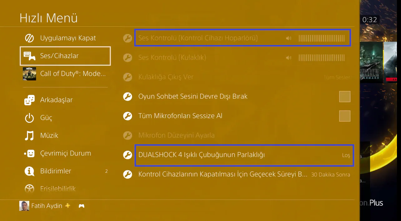 Bu işlem için konsolumuz açıkken PS tuşuna basılı tutacağız ardından Ses/Cihazlar menüsüne giriş yapacağız , görselde ki kısımları seçerek ayarları parlaklığı loş olarak ayarlayabilir , hoparlör sesini de minimuma indirebilirsiniz.