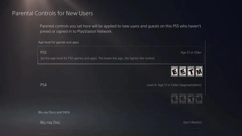 Muhtemelen en çok içerik kısıtlamalarını belirleme konusunda endişelendiğinizden, Yeni Kullanıcılar için Ebeveyn Kontrolleri (Parental Controls for New Users) seçeneğini seçmek isteyeceksiniz. Burada, oynanabilir PlayStation 5 (PS5) ve PlayStation 4 (PS4) oyunları için yaş sınırı belirleyebilir, Blu-ray ve DVD‘ler için yaş sınırı belirleyebilir, web taramasını kısıtlayabilir ve PSVR kullanımını kısıtlayabilirsiniz. ESRB yaş derecelendirmelerini merak ediyorsanız, ESRB‘nin web sitesinden daha fazla bilgi edinebilirsiniz.