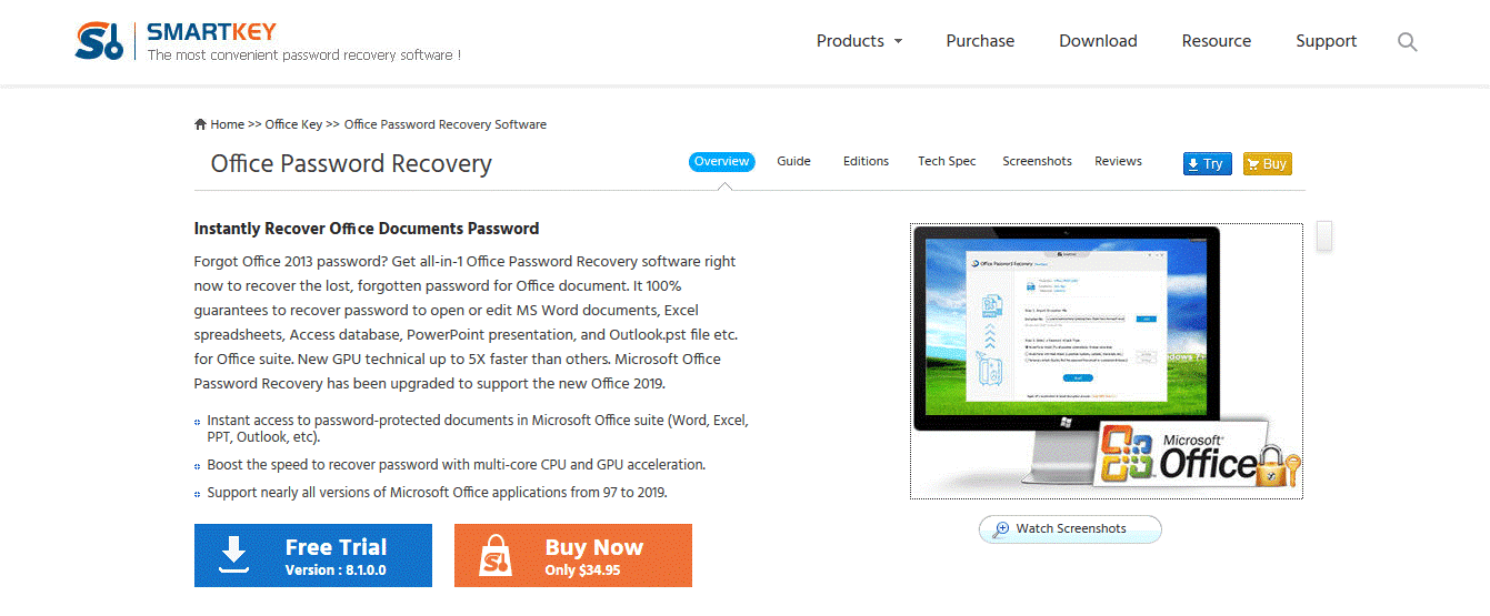 Program özellikle PowerPoint şifresini ve Excel, Outlook, Word, Access ve benzeri diğer şifre korumalı belgeleri kurtarmak için tasarlanmıştır. Basitçe söylemek gerekirse, Smartkey Office Password Recovery, eski Office 97’den en son Office 2019’a kadar tüm Microsoft Office sürümlerini destekler.