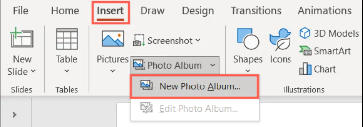 Ekle sekmesine gidin, şeridin Görüntüler bölümünde Fotoğraf Albümü > Yeni Fotoğraf Albümü’nü seçin.