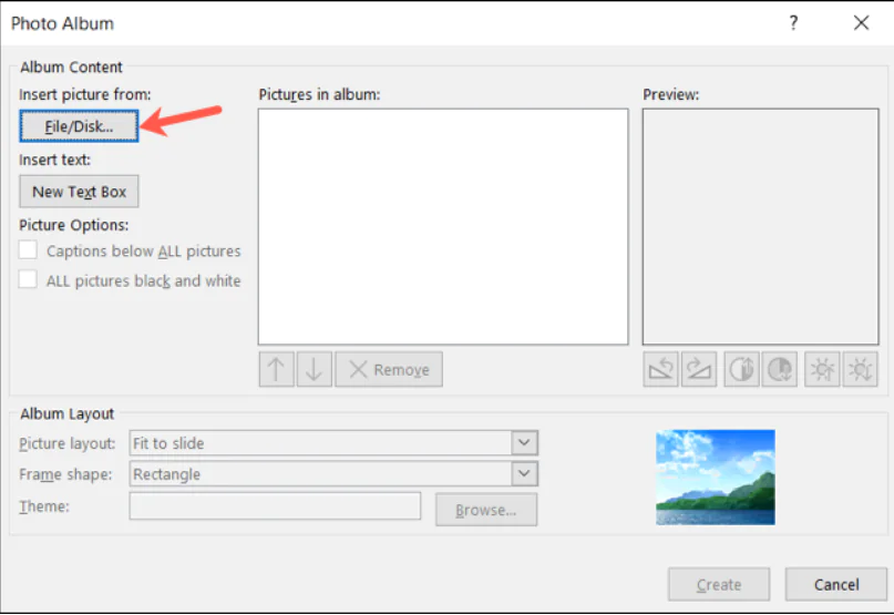 Fotoğraf Albümü penceresi açıldığında, kullanmak istediğiniz fotoğrafları ekleyerek başlayın. Solda, Resim Ekle’nin altında, “Dosya/Disk”i tıklayın.