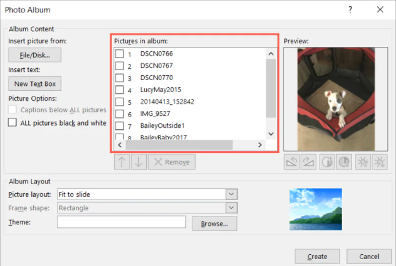 Birini seçip “Albümdeki Resimler” kutusunun altındaki yukarı ve aşağı okları kullanarak resimlerin sırasını yeniden düzenleyebilirsiniz. Eklediğiniz bir fotoğrafı silmek için Kaldır’ı da kullanın.