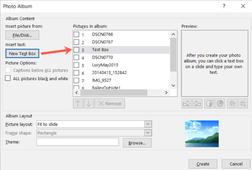 Fotoğraf albümüne bir metin slayt eklemek istiyorsanız, soldaki “Yeni Metin Kutusu”na tıklayın. Ardından, bu slaydı istediğiniz yere yerleştirmek için yukarı ve aşağı okları kullanabilirsiniz. Daha fazla metin slaytı da ekleyebilirsiniz. Sunuyu oluşturduktan sonra metni bu slaytlara ekleyeceksiniz.