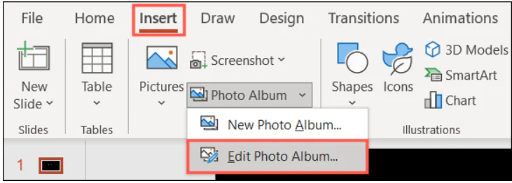 Slayt gösterinizi normalde yaptığınız gibi kaydedin. Ardından, fotoğraf albümünde değişiklik yapmak isterseniz Ekle > Fotoğraf Albümü > Fotoğraf Albümünü Düzenle’ye gidin.