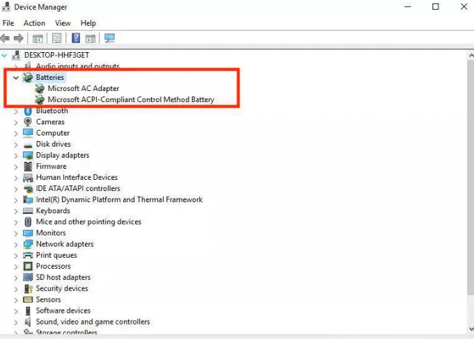 2-Genişletmek için listedeki Piller’i tıklayın; iki öğe görmelisiniz: Microsoft AC Adaptör ve Microsoft ACPI Uyumlu Kontrol Yöntemi Pili.