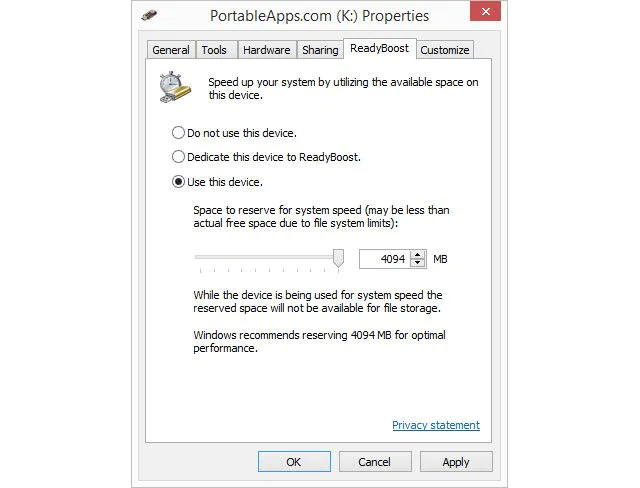 ReadyBoost, SuperFetch’e benzer şekilde çalışan, ihmal edilen bir Windows özelliğidir. Kullanıcı aktivitesini analiz eder ve bilgileri belirlenen flash sürücülere veya SD kartlara yazar. Bu tür bir önbellek, kötü şöhretli yavaş bir sabit sürücüde depolanan bilgilerden daha hızlıdır ve bu nedenle bilgisayar performansını artırabilir.