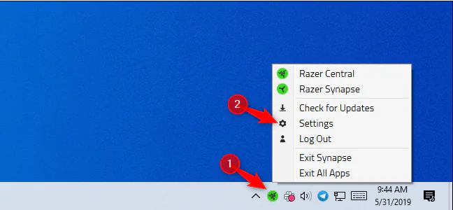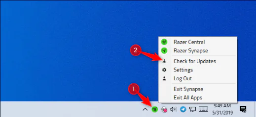 Razer Synapse, Razer Cortex ve diğer en yeni yazılımlarla ilgili güncellemeleri kontrol etmek için bildirim simgesinin içerik menüsündeki “Güncellemeleri Kontrol Et” seçeneğini kullanın. Bu sorunu gidermek için en son sürümleri yükleyin.