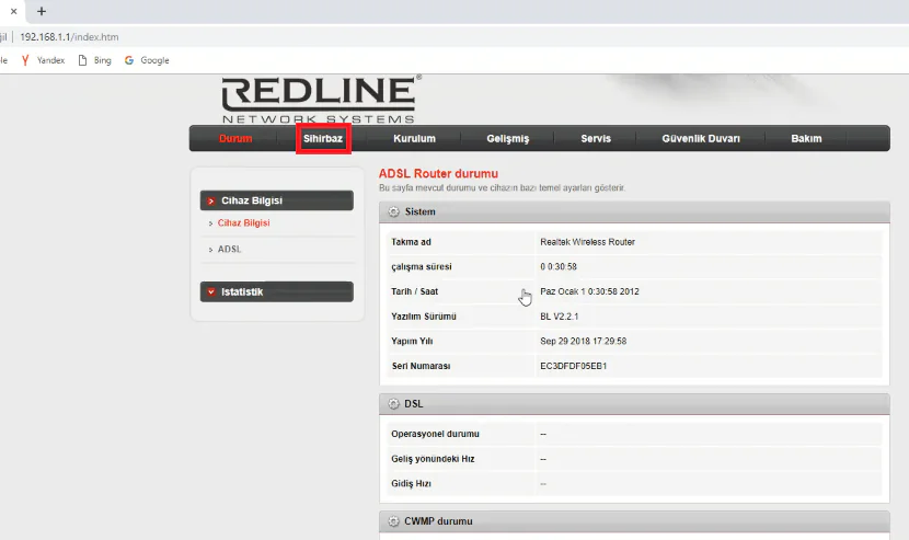 - Modem arayüz sayfası açılacak. Açılan sayfada üst kısımda bulunan menülerden Sihirbaz seçeneğine tıklayın.