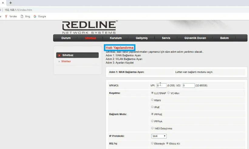 - ‘Hızlı Yapılandırma’ başlıklı modem kurulumu yapacağımız sayfa açılacak.