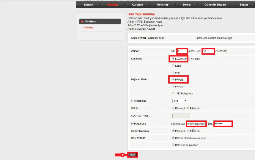 - Şifre: İnternet operatörünün verdiği ADSL şifresi yazılacak. (Örn: 1234567)